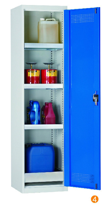 用于污染液體的存儲,可調式隔板,上下25mm可調 可移動式底部貯存盤高100mm,無縫焊接,更好防泄漏 門板的頂部及底部帶通風孔,自然通風,門開啟角度12。 隔板/貯存盤式層板每層最大承重60KG (可抽出式除外) 柜體最大承重承重:300KG