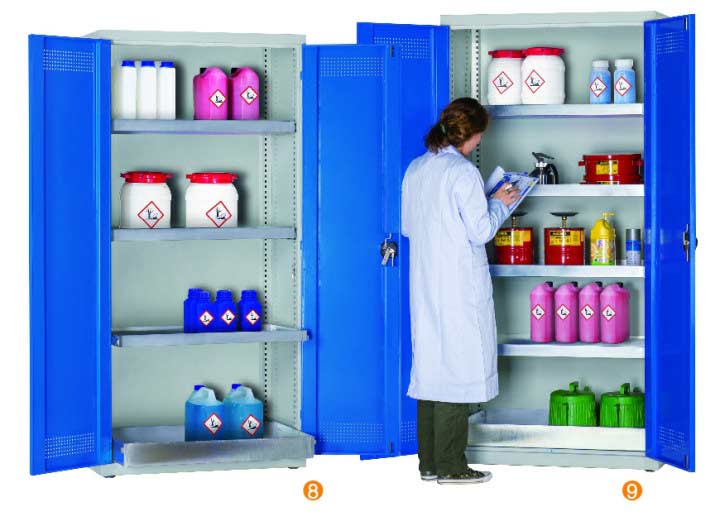 用于污染液體的存儲(chǔ),可調(diào)式隔板,上下25mm可調(diào) 可移動(dòng)式底部貯存盤高100mm,無縫焊接,更好防泄漏 門板的頂部及底部帶通風(fēng)孔,自然通風(fēng),門開啟角度12。 隔板/貯存盤式層板每層最大承重60KG (可抽出式除外) 柜體最大承重承重:300KG